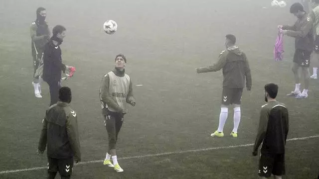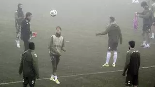 Jones cabecea un balon bajo la niebla al incio del entrenamiento de este miércoles en Afouteza. / Pablo H. Gamarra