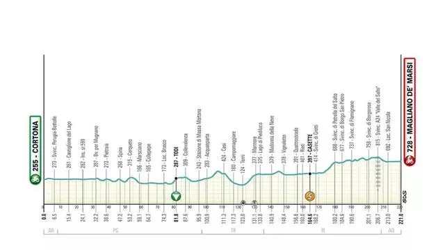 Con inicio en Cortona y final en Magliano de' Marsi, la etapa 3 de la Tirreno-Adriático cuenta con un recorrido de 221 kilómetros y un único puerto categorizado. A pesar de su longitud, tercera jornada de la carrera de los dos mares cuenta apenas cubre 1850 metros de desnivel positivo, aunque el broche final de la jornada contará con una rampa del 2,5% para desafiar la resistencia de los aspirantes a la victoria.