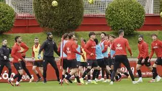 Los jugadores del Sporting, ayer, en Mareo, en el último entrenamiento antes de visitar Santander. / Marcos León