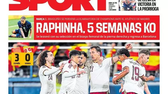 La selección española pasó con nota el examen de La Cerámica contra Serbia. Los de Luis de la Fuente ilusionan, tal como reza la portada de SPORT de este último sábado del mes de marzo. Un 3-0 más que convincente, con doblete de Oyarzabal y gol del debutante Víctor Muñoz, pero también con tres asistencias de tres barcelonistas: Fermín, Cubarsí y Ferran Torres.