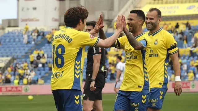 Jonathan Viera y Jesé felicitan a Miyashiro por su gol con la UD ante el Ceuta / J.PEREZ CURBELO