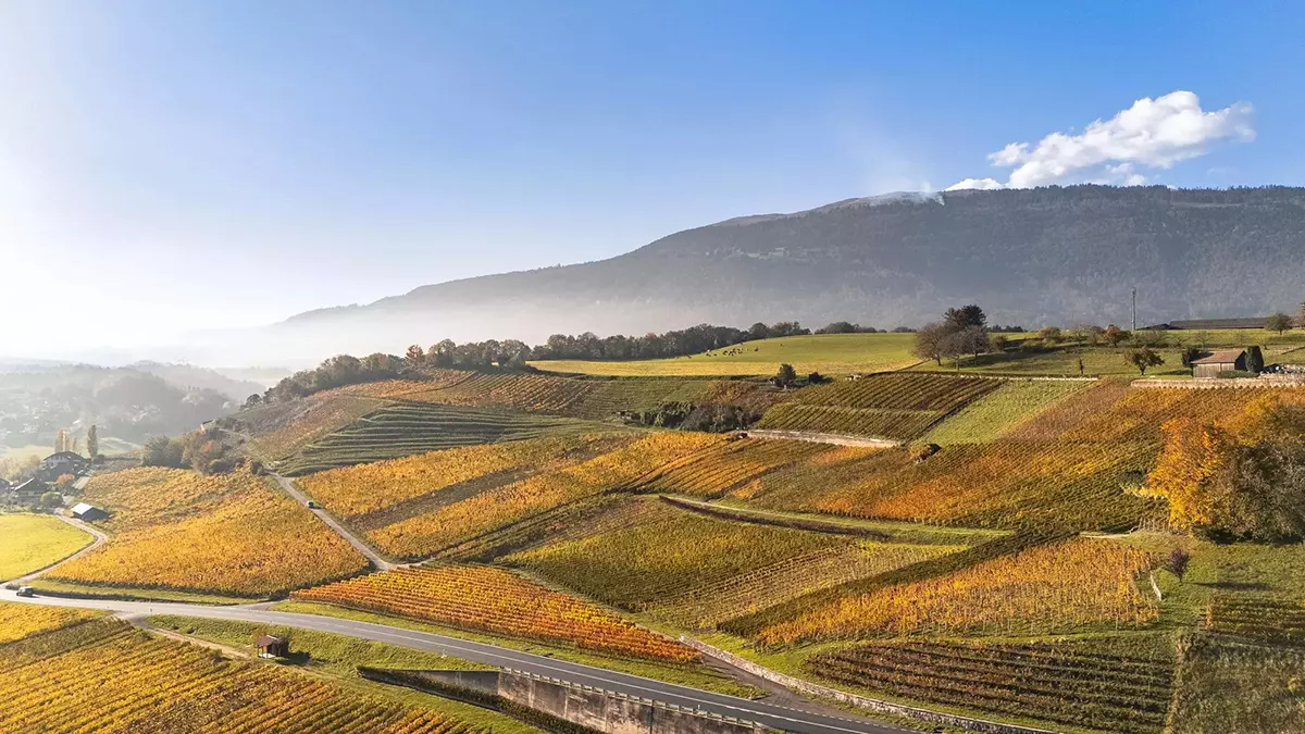 Por su parte, la AOC Côtes de l’Orbe, con 180 hectáreas repartidas en 22 municipios, es una de las regiones vinícolas más antiguas de Suiza. Aquí la Gamay es la variedad estrella, cultivada junto con Pinot Noir y Chasselas. Lo singular de esta AOC es que muchas explotaciones son mixtas, y además de viñas, se cultivan cereales y se cría ganado, lo que imprime un carácter muy particular al paisaje. En otoño, los viñedos se tornan dorados y rojos, y la experiencia de catar un vino con vistas al lago o al Jura se convierte en un recuerdo imborrable.
