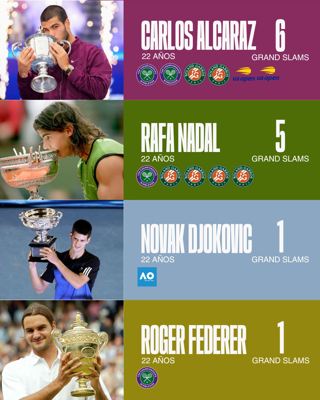 Su sexto título de Grand Slam iguala a Carlos Alcaraz con Bjorn Borg y Rafa Nadal como los únicos hombres en toda la historia en llegar a tal cifra antes de los 23 años (a la edad de Alcaraz, solo Borg lo consiguió; Rafa lo haría unos meses después). Atrás quedan ya nombres como los de Sampras, Becker, McEnroe, Courier y Wilander (4 Grand Slams a los 22), avisando de la capacidad de su figura. Djokovic y Federer apenas tenían un 'grande' en sus vitrinas a su edad.