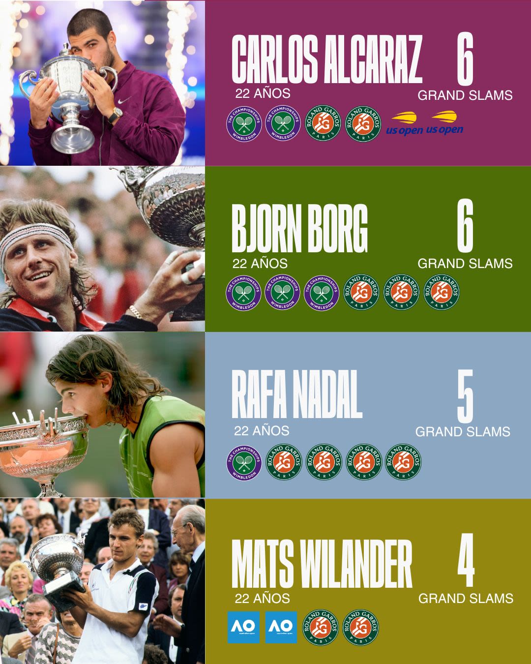 Su sexto título de Grand Slam iguala a Carlos Alcaraz con Bjorn Borg y Rafa Nadal como los únicos hombres en toda la historia en llegar a tal cifra antes de los 23 años (a la edad de Alcaraz, solo Borg lo consiguió; Rafa lo haría unos meses después). Atrás quedan ya nombres como los de Sampras, Becker, McEnroe, Courier y Wilander (4 Grand Slams a los 22), avisando de la capacidad de su figura.