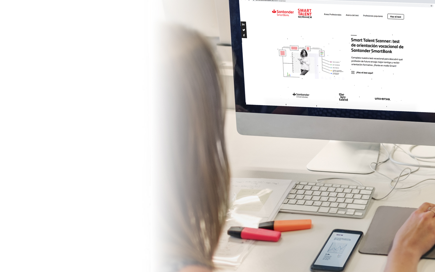omo parte del compromiso de Santander con la educación y con la empleabilidad de los más jóvenes y de aquellos de cualquier edad que buscan reenfocarse laboralmente nace Smart Talent Scanner, la última de las herramientas de la entidad bancaria consistente en un test vocacional que permite descubrir oportunidades para explotar el talento y la preparación personal.